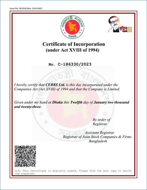 Certificate of Incorporation of CERRS as issued by the RJSC, Ministry of Commerce, Govt. of the People's Republic of Bangladesh.
